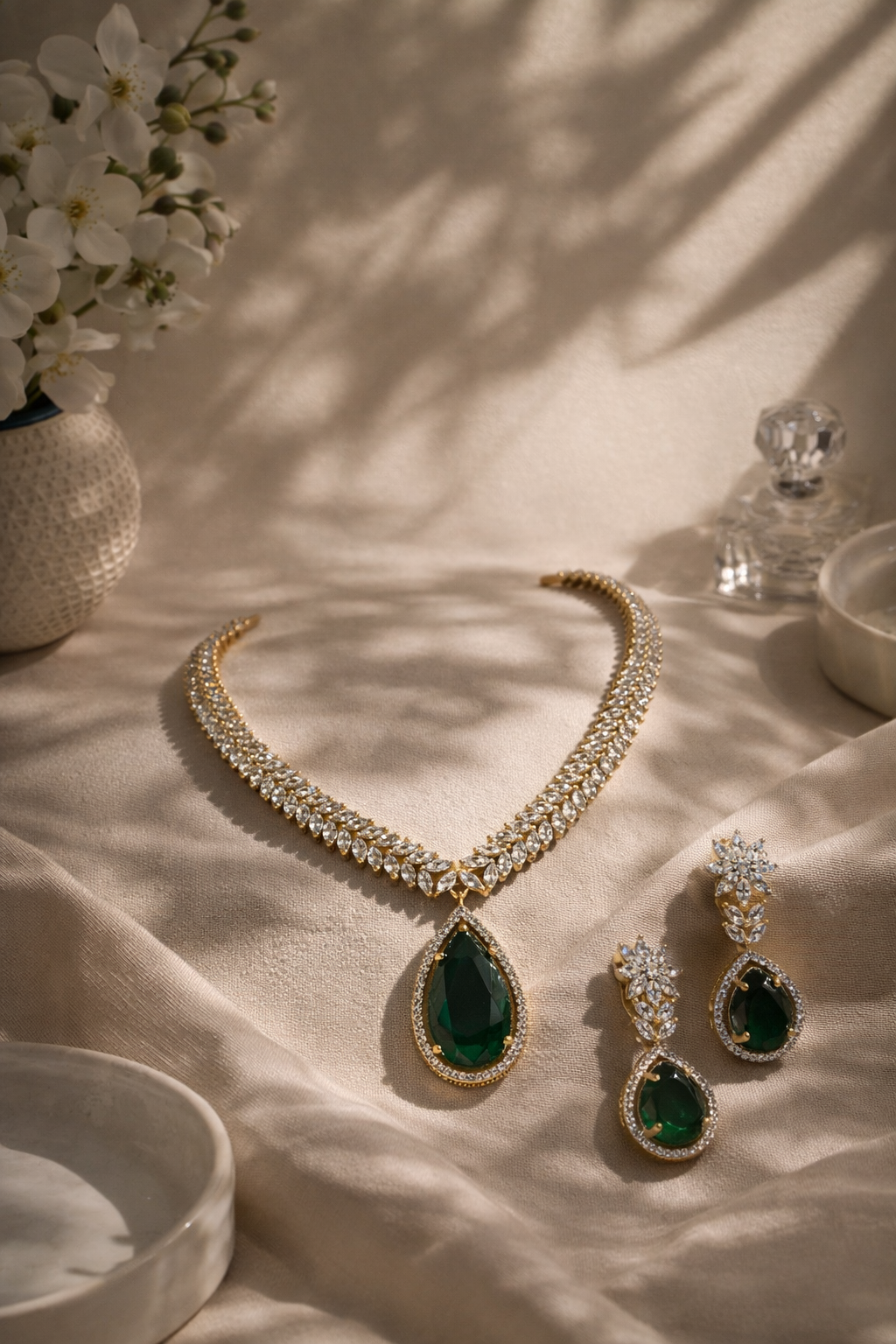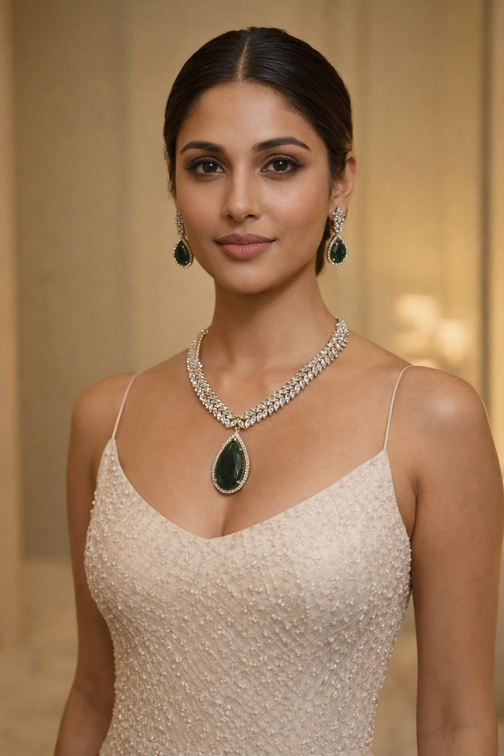 The Emerald Verdant Pear Suite is a celebration of deep, saturated color and architectural brilliance. This set features a sleek, V-contoured necklace composed of double-layered marquise-cut stones that lead the eye to a majestic, oversized pear-shaped emerald drop. The accompanying earrings echo this motif with floral-inspired studs and matching pear-cut pendants. Set against a warm gold-toned finish, this ensemble offers a rich, sun-drenched glow that radiates opulence.